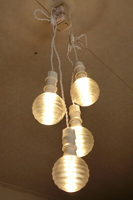 LED の光を美しく拡散する特徴的な 3Dデザイン電球を密集させた小型・超軽量の 4 灯密集型ペンダントライトです.付属する直径 12 cm の電球 Stretch1 (ストレッチ・ワン) は 光が伸びて きらめき輝く裸電球です.あかるさは白熱灯 240 W 相当 (消費電力 32W) です.LED は日本国内向けに設計されていて,平均 4 万時間使用できます.付属のコードクリップで電球の位置 (高さ) を調節できます.裸電球を使用しているので,ペンダントライト本体には傘は付属しません. 付属する電球のカバーは一様に光を拡散させる通常の電球カバーとちがって,当社独自の螺旋 3D 印刷によって製造しています.この電球カバーの幾何学的デザインの波模様 (渦巻き模様) が,円形に配置された多数の LED の光を美しく拡散させます.従来のガラスやプラスティックでは表現できない光をつくりだす,世界でだれもまねできない特徴的な種類のランプです.LED は下向きについているので電球の直下がもっともあかるくなりますが,電球カバーが光を拡散するので横方向もあかるくなります. ★