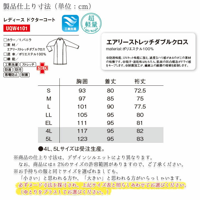 ポイント ・凛として美しいシルエット・機能美を漂わせた品格のあるデザイン・安心感と信頼感を高めるスタイルがここに完成 ■品名・品番 ドクターコート(女性/レディース) UQW4101 ■カラー 1.VAN(バニラ) ■サイズ S M L LL EL 4L(受注生産) 5L(受注生産) サイズ表(仕上り寸法) メーカー基本ヌード寸法※4L・5Lはメーカー備蓄が無い場合、受注生産となります。